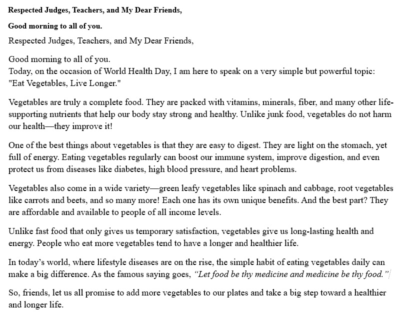 Q.4:- Imaging that you are talking part in an elocution competition on words health day. the topic ; ‘Eat vegetables, live longer’. prepare a speech on the gives topic to be delivered at the competition. Use the points give below. you may add some your own points: