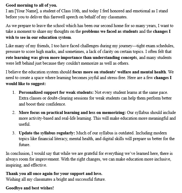 Q2:- Draft a speech to given during the farewell for standard 10th on the topic, Use the following points to draft your speech;